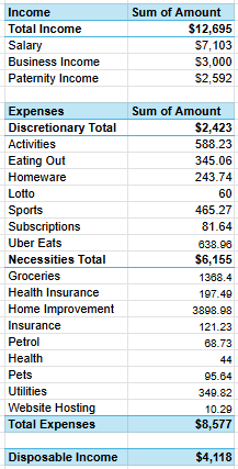 The biggest portion of my spending is necessities ($6,155) — mainly home improvement ($3,898) which were two new heatpumps for the house, groceries ($1,368), and insurance-related costs. My discretionary spending totals $2,423, with sports ($1,065) and Uber Eats ($639) being the largest categories. Far too much on Uber Eats but it’s been a life safer when we’re in the trenches with a newborn and some days we’re knackered.